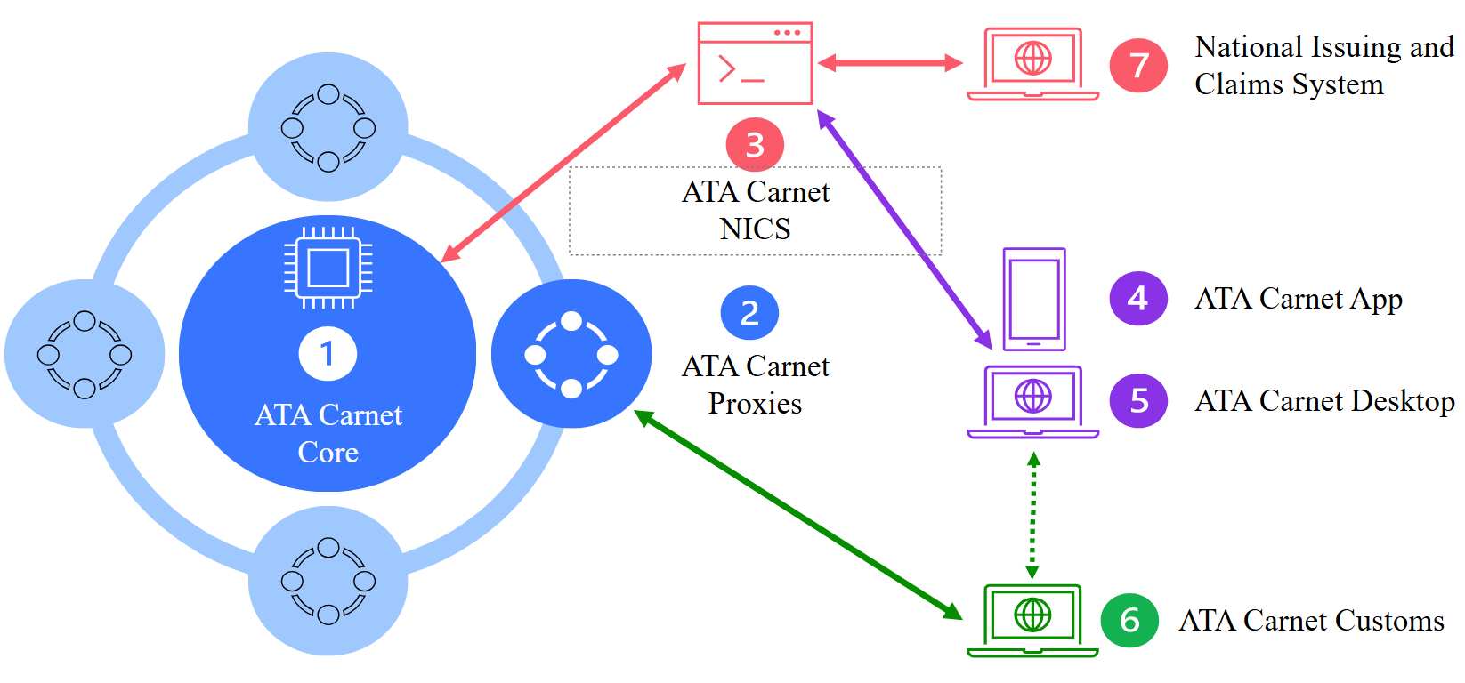 The following is a schematic representation of the different components of the ATA Carnet system and how they interact with each other.