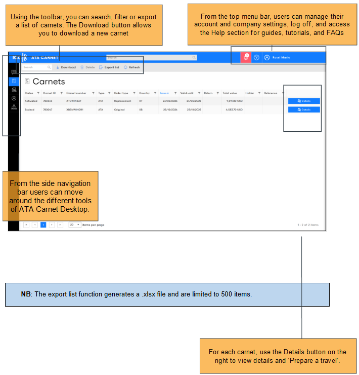 The ‘Carnets’ section is your main hub for managing all carnets in ATA Carnet Desktop. Whether you hold or manage shared carnets, this module offers an organized list of active and archived documents. You can quickly view details, track statuses, and perform actions like downloading, sharing, or updating carnet information, helping you efficiently manage multiple carnets and maintain compliance.